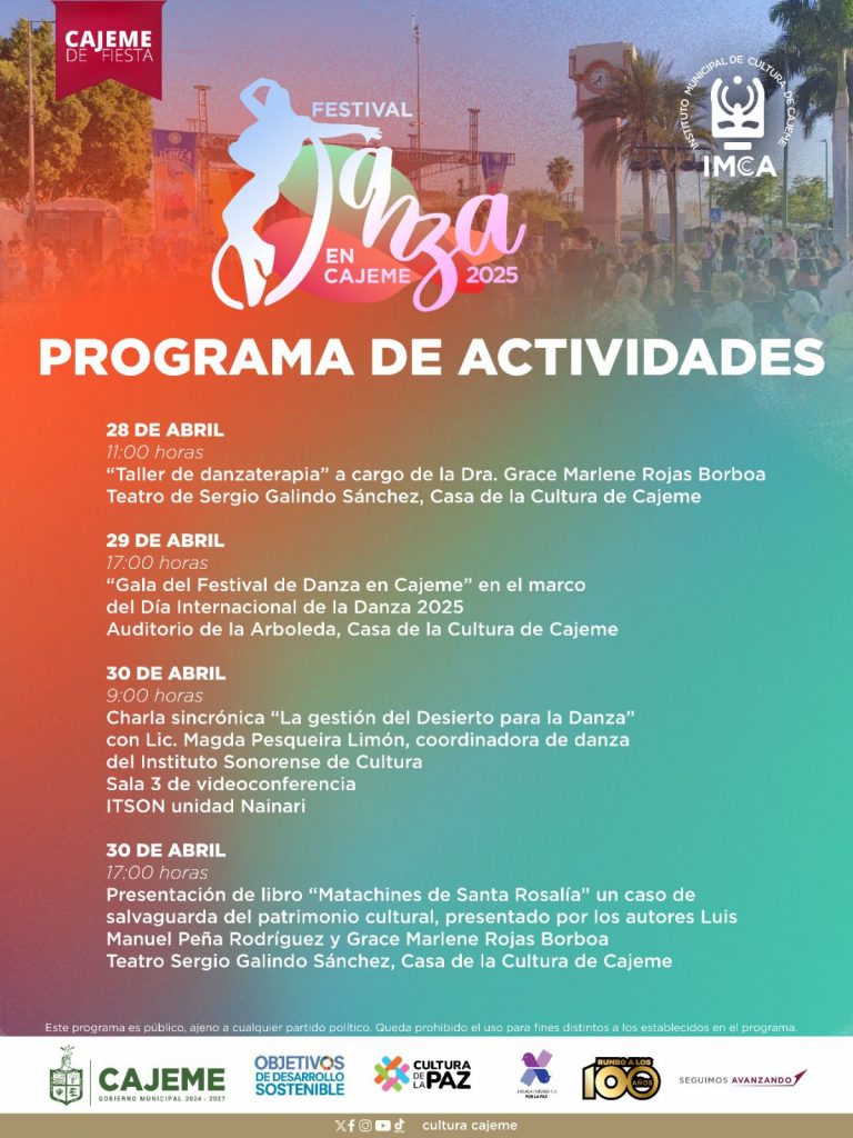 Cd. Obregón, Sonora.- Con el fin de promover las manifestaciones culturales en el Municipio y que las expresiones y espacios artísticos sean disfrutados por la comunidad, el Gobierno Municipal, a través del Instituto Municipal de Cultura de Cajeme (IMCCA), en coordinación con directoras y directores de diferentes agrupaciones dancísticas que conforman el Comité Organizador, invitan al Festival de Danza Cajeme 2025.