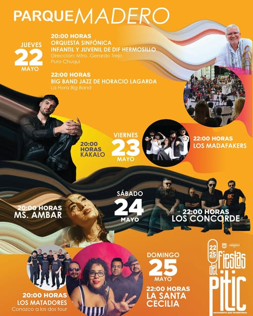 Hermosillo, Sonora.- Del jueves 22 al domingo 25 de mayo el Parque Madero será punto de encuentro para el disfrute del variado repertorio de actividades de las Fiestas del Pitic 2025, informó Marianna González Gastélum, directora del Instituto Municipal de Cultura y Arte (IMCA).